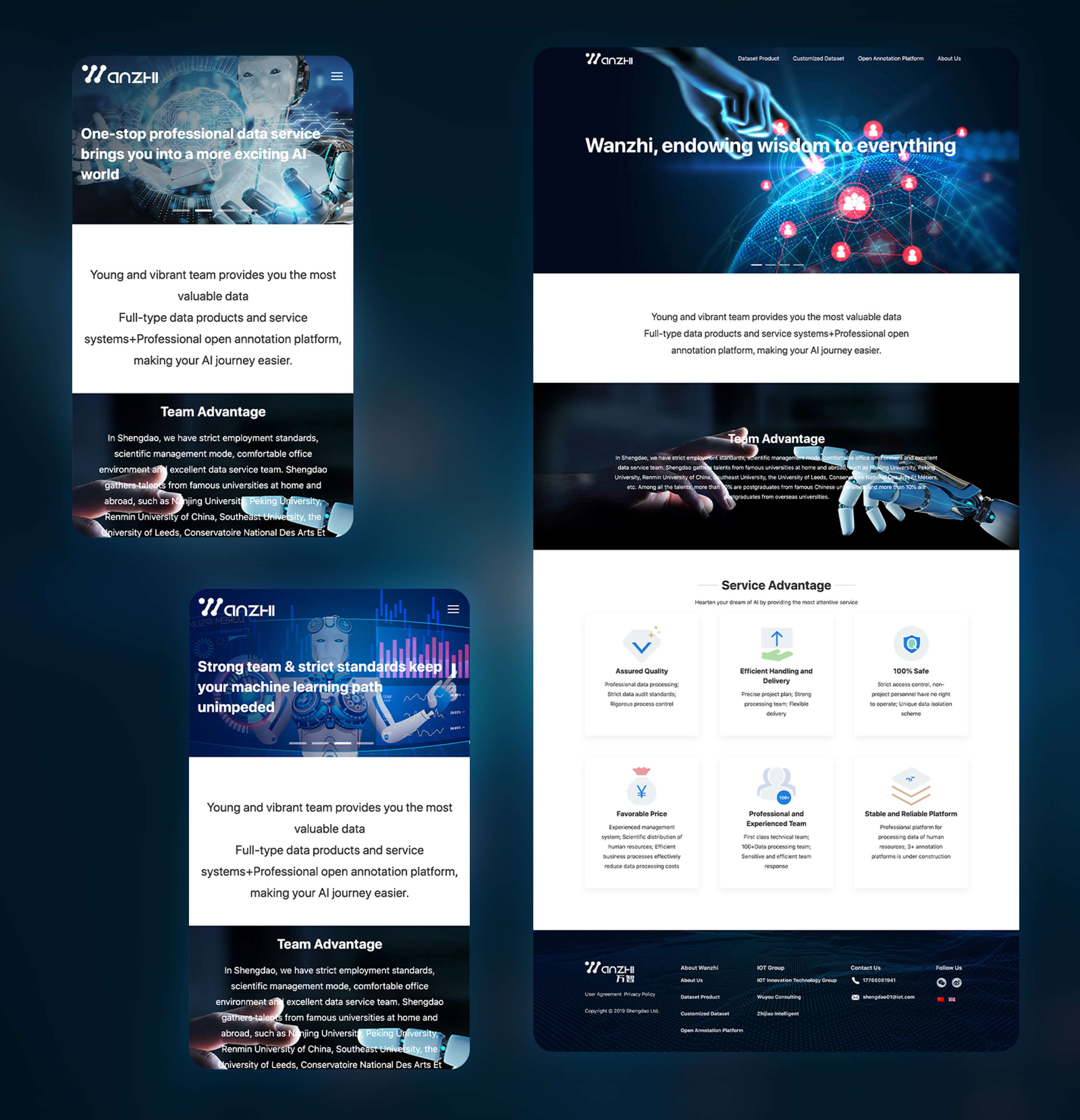 万智,充满活力和追求的人工智能数据分析与服务公司。科技感满满的网页设计, 整站更多采用 AI 大图渲染,烘托科技与大数据氛围。